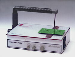 Application: Cutting scribed PCB's, SMD or conventional, with fittings on one or both sides. The panel is pushed on a steel guide over the diamond milling disk and cut off in the process. Advantages: